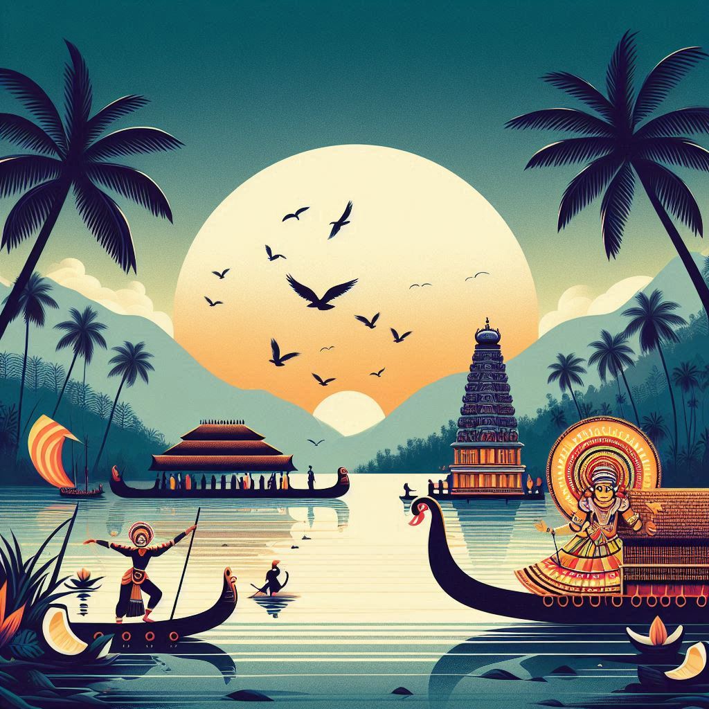 11/12/2024 1:29 PM 217272 Kerala Piravi wallpaper with coconut trees, Kathakali, and Vallamkali.png